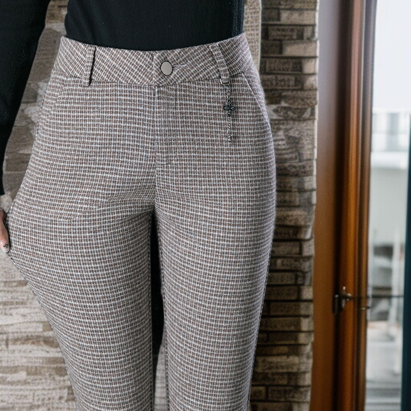 高弾性チェック柄冬厚手パンツ ハイウエストルーズストレートパンツ 繊維高弾性パンツ