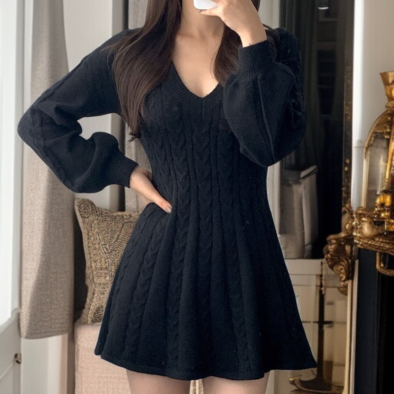秋冬のヴィンテージ風麻の花柄Vネックウエストマークの小柄ロングスリーブAラインニットワンピース女性向け